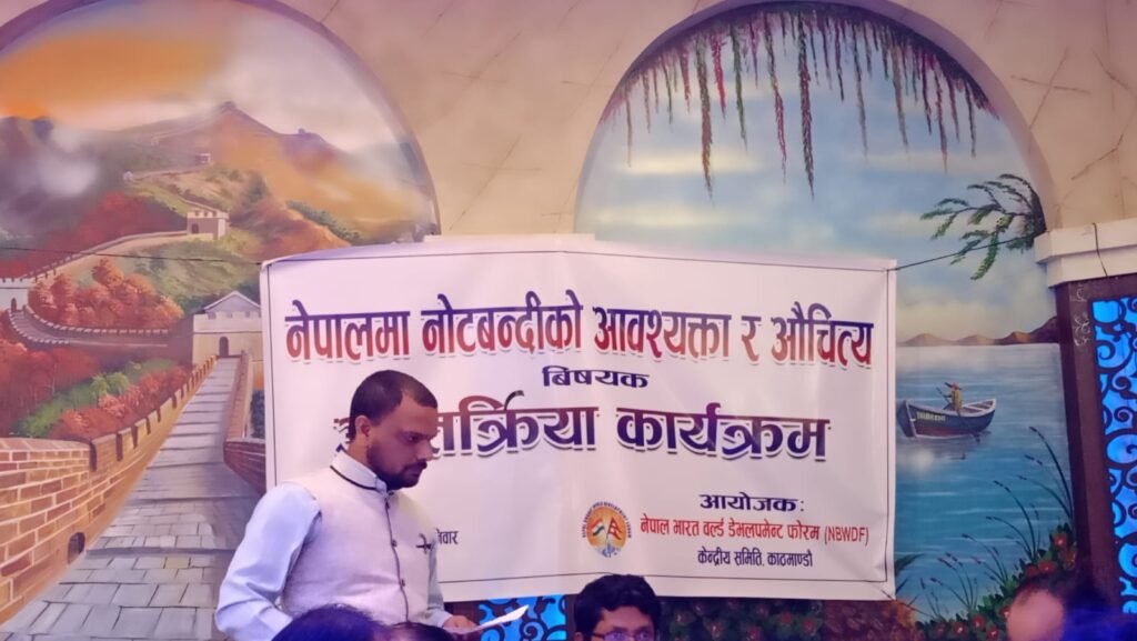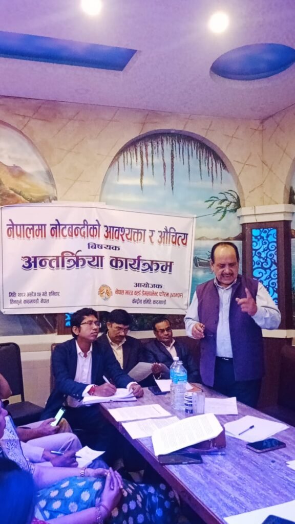 काठमाडौं । नेपाल–भारत वर्ल्र्ड डेभलपमेंट फोरमद्वारा आज काठमाडौंमा नोटबन्दीको विषयमा एक अन्तरक्रिया कार्यक्रम सम्पन्न भएको छ । कार्यक्रममा फोरमका अध्यक्ष मधुरेन्द्र चौधरीले नोटबन्दी नेपालको लागि आवश्यक रहेको भन्दै नोटबन्दीले भ्रष्टाचारी नांगिने र लुकाएर राखेको पैसा बाहिर आउने बताए । उनले नोटबन्दी भारतमा पनि भएको र धेरै नोट बैकिङ्ग प्रकृयामा आएर भारतको अर्थतन्त्र बलियो भएको जिकिर समेत गरे ।